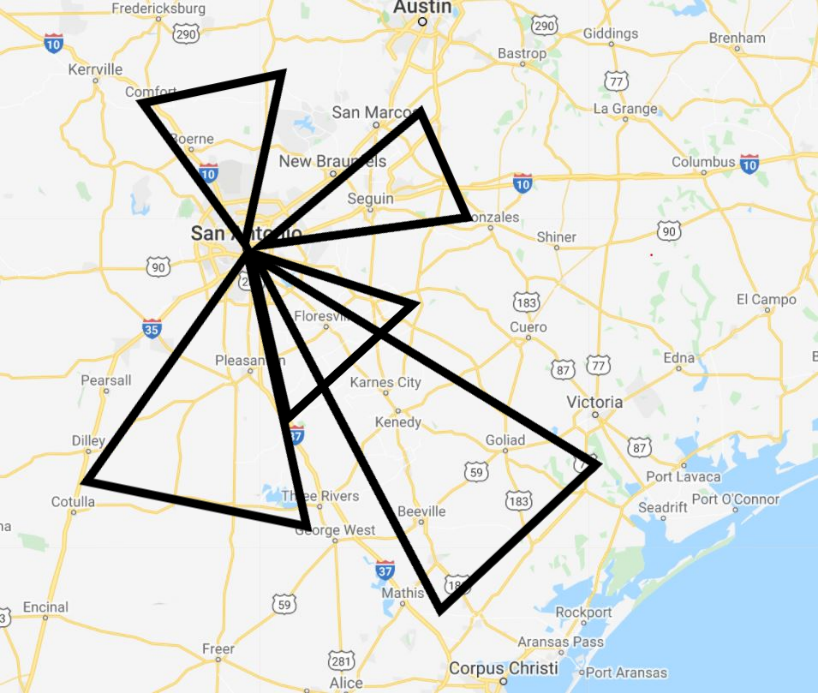 During our study, each day was spent with two members of the Entanglement team driving a route to transect the area around Bexar county, covering approximately 300 miles of terrain every day. Each trip was carefully planned in order to drive up- and down-wind of important features and installations in that day’s sub-region of Bexar county, so that we could estimate emissions from each “pie-slice” around San Antonio (see below).