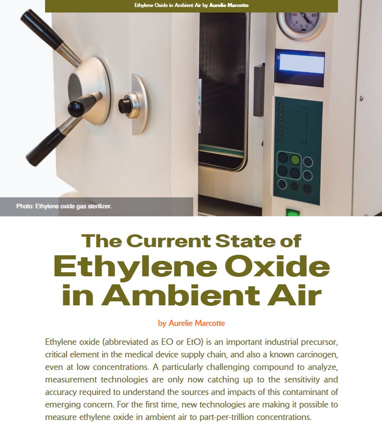Ethylene oxide (EtO) is an important industrial precursor, critical element in the medical device supply chain, and also a known carcinogen, even at low concentrations. A particularly challenging compound to analyze, measurement technologies are only now catching up to the sensitivity and accuracy required to understand the sources and impacts of this contaminant of emerging concern. For the first time, new technologies are making it possible to measure ethylene oxide in ambient air to part-per-trillion concentrations. Read more in this article "The Current State of Ethylene Oxide in Ambient Air" by Entanglement Technologies' Aurelie Marcotte in EM Magazine, a publication of the Air & Waste Management Association.