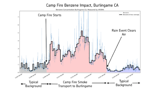 In addition, an AROMA instrument detected the significant chemical pollution generated by the Camp Fire and blown 155 miles to our facility in the San Francisco Bay Area. This analyzer was operating in base station mode (operating 24/7, unattended, and producing 120 measurements per day). During this event, concentrations spiked to the highest levels observed at our facility and remained an order of magnitude higher than typical concentrations for nearly 10 days, until changing weather and wind patterns transported the smoke and pollution plume away from the Bay Area.